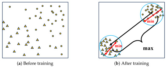 In contrastive learning, InfoNCE loss [37] can not only increase the similarity between positive samples, but also reduce the similarity between negative samples. Inspired by this method, we hope to achieve the results as shown in Figure 5; that is, after the model is trained by the loss function, each pixel of the image is projected into the feature space, the distance between pixels of the same category is as small as possible, and the distance between pixels of different categories is as large as possible. To achieve this goal, we first define a distance function.