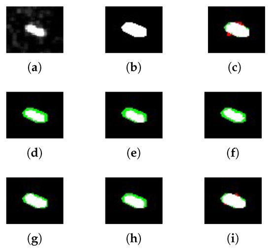 In the label smoothing module, we first apply a median filter to the output, smoothing the edges and removing the small size of the pepper noise. Then, we use an eight-connected neighborhood clustering module [38] to cluster all pixels, calculate the area of each connected domain, and retain the max area of the connected domain. If any two pixels and in result maps M have intersection areas in their eight-connected neighborhoods, i.e.,