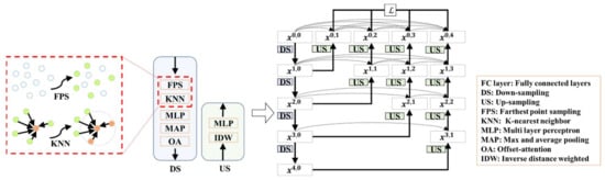 where represents the continuous operations of the Linear, BatchNorm, and ReLU layers. Then, the up-sampling (US) block uses the same inverse distance interpolation as in PointNet [45] for interpolation, followed by global feature learning through an MLP.