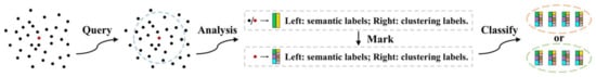 Specifically, we designed an algorithm based on heuristic strategies to bring the adjustment of semantic and clustering labels for each point closer to their true values in a bottom-up manner by combining local analysis and global optimization. This algorithm focuses on the boundaries where discrepancies occur between semantic and clustering labels in 3D space. First, we marked and classified points, as shown in Figure 4. The algorithm starts by selecting k nearest neighbors of each point in its local neighborhood using a ball query method. Then, it compares the labels of these neighboring points to search for differences. If the semantic labels are varied while the clustering labels are uniform, or vice versa, the point is marked to reflect this discrepancy.
