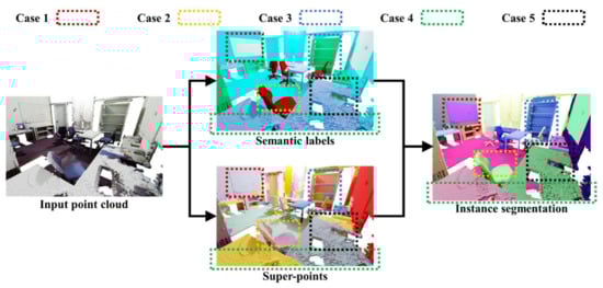 Then, for points classified into one category, we conduct decision fusion analysis on the clustering regions they are in. An example of instance segmentation is shown in Figure 5. If there are the same clustering labels but different semantic labels in the region (Case 1), we choose to believe the semantic boundary and modify the instance labels of these points according to the semantic boundary. If there are different clustering but same semantics in the region, we conduct decision analysis based on the number of classified points and the number of points in the clustering region they are in. If the number of classified points is less than a pre-defined threshold (Case 2), or the number of clusters in the clustering region is greater than a pre-defined threshold (Case 3), we choose to believe the semantic boundary and modify the instance labels of these points according to the semantic boundary. On the contrary of Case 2 and Case 3 (Case 4), we choose to believe the clustering boundary and modify the instance labels of these points according to the clustering boundary. If there are different semantics and clustering labels in the region (Case 5), we choose to believe the semantic boundary and modify the instance labels of these points according to the semantic boundary.