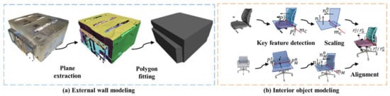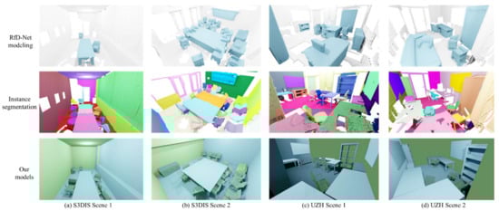 After instance segmentation, the locations of walls and interior objects are determined, so the hybrid-modeler can be executed by replacing the scatted point clouds with regular 3D shapes, as shown in Figure 6.