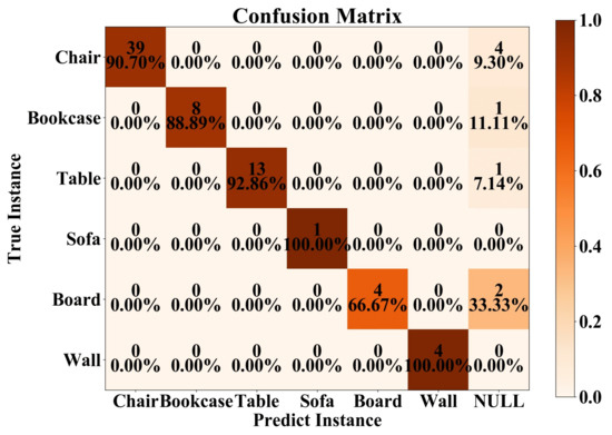 We define some geometric feature-based patterns for the typical furniture in the model library, such as a sofa, chair, bookcase, and table. For instance, each chair contains two planes and an intersecting line segment, and each table or cabinet contains three orthogonal planes from an observation angle, etc. Based on the labels of the instance point cloud and the preset geometry feature patterns, we can find matching features between the model and the point cloud. The following is an explanation of feature estimate and transformation for objects such as chairs. The estimate processer is similar for other furniture as well.