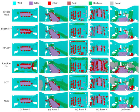 The indoor semantic parsing results include point labeling results and the further instance segmentation results. We conducted tests on the S3DIS dataset [58] and the UZH dataset [59]. The method has been compared with other methods, including PointNet++ [46], KPConv [47] and RandLA-Net [48], and PCT [52]. The visualization results of semantic labeling for the point clouds are shown in Figure 7, where the dashed boxes indicate some areas with serious incorrect labels. The visual results show that our results are more in line with the ground truth. Even in the case of a small sample, our method can effectively segment complex categories. This capability is attributed to the network’s effective semantic recognition of high-frequency information and its ability to aggregate local features, thereby achieving accurate segmentation inferences.