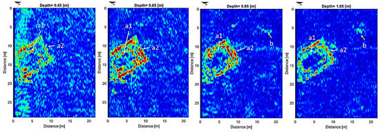 Paestum (Italy). Tomographic images reconstructing the Doric temple structure at a depth ranging between 0.65 and 1.05 m. The high amplitude reflections are due to the foundation system of the buried building (a1,a2) and a possible altar (b) [19].