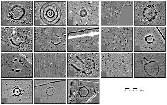 Depending on the geological context and on the prospection targets, magnetometry is among the most used geophysical methodologies for supporting archeological research, also thanks to very clearly interpretable results. This is the case of the survey of an Iron Age enclosure [22], where the positive anomaly of the ditch was found, accompanied by a fringe of negative data. Similarly, the large pit in the SW corner of the enclosure has a negative halo, most prominently to the north. Under this aspect, the Stonehenge Hidden Landscapes Project (SHLP) represented the successful application of the MAG method in the space surrounding Stonehenge (United Kingdom). Magnetograms of regular and several more irregularly shaped segmented and penannular ditches and pit circles, of various shapes and sizes, are perfectly drawn (Figure 6) [23].