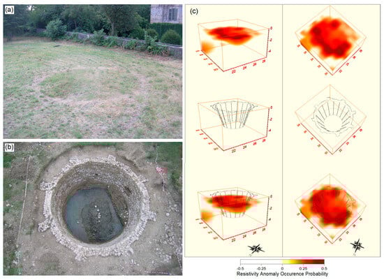 Successful examples are also discussed by Cozzolino et al. [39,40,41], who used the resistivity methods employing a four-electrode array split into two mobile (one for energizing and one for the potentiometric probes) devices for the measurement of a single layer of resistivity values. Apparent resistivity data were processed using the 2D (3D in the case of multiple configurations of the devices’ distances, leading to multiple depth maps of raw data) probability-based electrical resistivity tomography inversion (PERTI) algorithm [42]. The results, validated by excavations, identified resistive anomalies associable with the presence of internal divisions with a radial development, such as the theater at Agrigento (Italy) [39], roads and structures at Egnazia (Fasano, Brindisi, Italy) [40], and the ground floor plan of Villa Medici di Pratolino (Vaglia, Firenze, Italy) [41], as shown in Figure 8b and Figure 9.