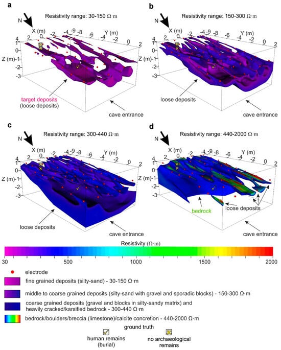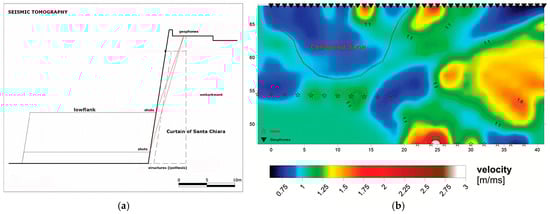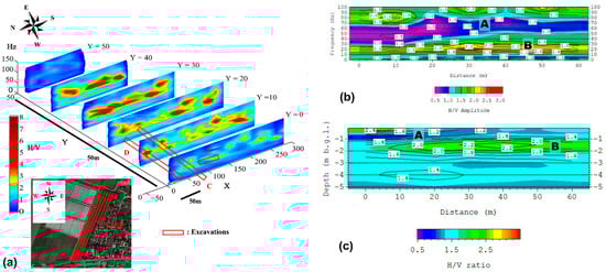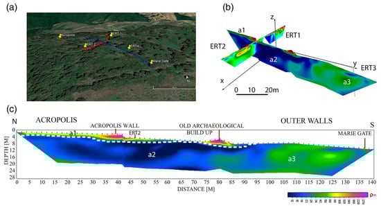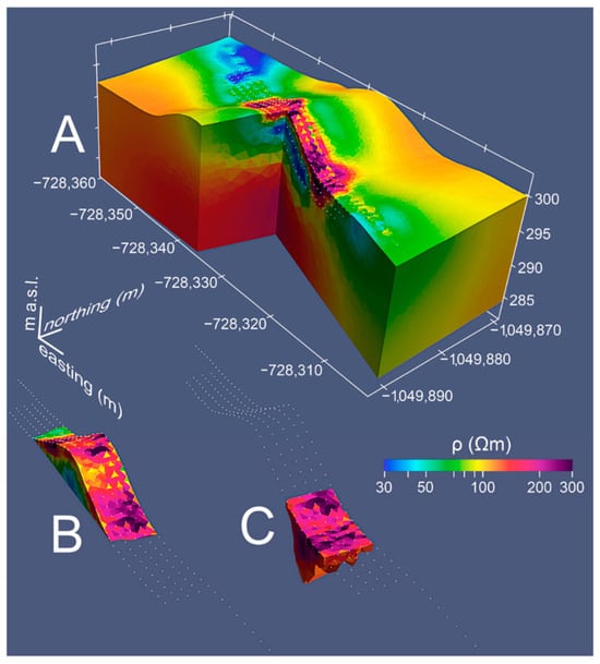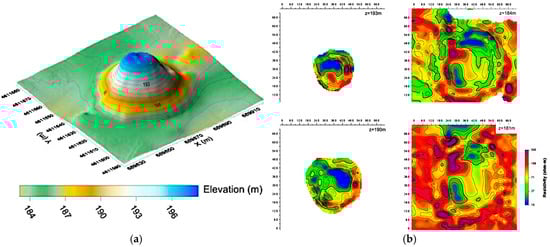 A rich literature testifies a broad use of ERT for different applications in heterogeneous archeological sites and varying geological settings. Masini et al. [43] used ERT for detecting the archeological structures covered by alluvial deposits and the building materials at the site of Kaifeng (China). In this context characterized by clay soils and a great thickness of soil superimposed on the archeological levels, the electromagnetic methodologies do not provide useful information. Conversely, the ERT technique permits the identification of the stratigraphic succession of the site. Five layers characterized by distinct values of resistivity, and presumably associable with the different phases of the site, were detected. Furthermore, strong resistive anomalies are detected at a depth greater than 2.5 m, in correspondence with a small structure characterized by rammed earth walls surrounded by a fence. Vott et al. [44], with a multi-proxy approach, have tried to reconstruct the history and evolution of Ostia’s river harbor (Italy). Electrical resistivity tomography surveys, carried out by adopting a Wenner–Schlumberger electrode array and electrode spacings of 0.75 m and 1 m, have contributed to identifying subsurface structures and the local stratigraphy. Furthermore, the data have provided the information needed for planning the vibracoring sites. The joint results have allowed for the identification of the originally vaulted chambers and the opus reticulatum walls between them. The interpretation of ERT patterns in terms of potential archeological features is often performed thanks to possible data redundancy, which can come from the synergistic use of multi-method surveys and the acquisition of parallel and crossing ERT lines, in which it is easier to detect and follow spatially coherent signals (Figure 10) [45].