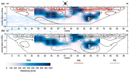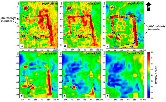 Tsokas et al. [36] demonstrated the potential of the simplest setup of the resistivity method by reconstructing the layout of the urban complex of Europos (Greece) using a twin probe array (this kind of resistivity method is also known as the electrical resistance method). The result was an impressive image of the subsoil in terms of apparent resistivity, which allowed for the identification of both archeological structures and the different phases of the settlement, characterized by two distinct building orientations (Figure 8a). The data were collected by positioning the current electrode and the corresponding potential one in a remote area (>30 times the spacing of the mobile ones) and moving the other current and potential electrode from one measuring position to another. Using a similar approach, Hargrave et al. [37] investigated the site of Fort Riley (Kansas, USA), accurately locating, with high accuracy, the building locations of Army City. Gaffney et al. [38] also performed resistivity measurements for the discovery of the theater of the ancient city of Sparta (Greece); in this case, the results are combined with the ones obtained by the topographical survey.