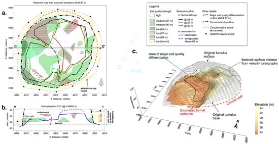 Furthermore, Urban et al. [27] adopted the methodology to investigate archeological sites ranging from the terminal Pleistocene to historic periods located at high latitudes. Figure 7b shows the results obtained at the site of Swift Water Place located in Alaska (USA), where magnetometric measurements integrated with GPR and electromagnetic induction data were performed to identify the locations of hearth anomalies, which were found to be corresponding to the present house depressions.