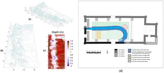 Another suggestive example concerning the use of GPR in urban contexts was described by Piro et al. [17], who investigated the subsoil of the St. John Lateran Basilica’s external areas in Rome (Italy), adopting the frequencies of 400 and 70 MHz for reaching depths of up to 3.4 m and 6.7 m, respectively, and detecting structures belonging to the medieval and Roman ages. Also, Masini et al. [18] presented an urban prospection with GPR investigations, supported by archeological data that have effectively contributed to the identification of Inca structures under a few decimeters of subsoil in the main square of Cusco (Peru). The achieved results highlight different stratigraphic layers in the center of the city, demonstrating GPR’s capability in detecting fundamental archeological features for the comprehension of the evolution of historic cities.