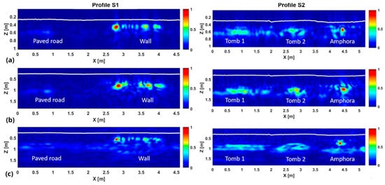 Capozzoli et al. [19] successfully used microwave tomography for better imaging of a buried temple located near the fortification wall of the Greek city of Posedonia (Paestum, Italy). The remains of a small Doric temple backing onto the ancient city’s walls were found, also with the support of archeological data and magnetometric analyses, by collecting GPR data according to a grid of parallel lines equally spaced 0.5 m apart in two perpendicular directions, at frequencies of 200 and 600 MHz. The depth slices shown in Figure 4 highlight the foundation system of the temple at different depths, including isolated reflections presumably associable with the other nearest archeological features.
