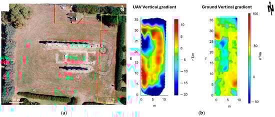 Caldara et al. [26] successfully used the methodology in tandem with aerial observations for investigating the archeological site of Masseria Pantano, located near Foggia, Italy, which has evidence of a long-term human presence dating back to the Neolithic period. An area of 7.6 ha was investigated with parallel profiles equally spaced 0.5 m apart, employing a cesium vapor magnetometer. Results have confirmed the presence of round-shaped marks due to Neolithic ditches, a field system network, and traces of a Roman road and linear and square cropmarks, probably related to the medieval age. Magnetic data have also detected a strong anomaly up to the depth of 3 m below the layer initially considered of interest for the corresponding archeological purposes, as demonstrated by archeological trenches and boreholes of an accommodation work made by the Romans, supposedly a drainage channel (Figure 7a).