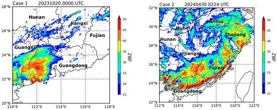 On 20 October 2023, heavy rainfall occurred in Guangdong, Guangxi, and the surrounding areas under the influence of Typhoon Sanba. From 0000 UTC on the 19th to 2200 UTC on the 20th, extremely heavy rainfall amounts of 250–450 mm were observed in areas such as Maoming, Zhanjiang, and Yangjiang in Guangdong, with some localities in Beihai exceeding 500 mm (according to the Central Weather Bureau: Weather Bulletin). Radar reflectivity at 0000 UTC on the 20th shows that areas with reflectivity values above 35 dBZ are concentrated in western Guangdong and eastern Guangxi, indicating heavy precipitation in these regions. Reflectivity values between 15 and 35 dBZ were mainly observed in southern Hunan and parts of Fujian, where the precipitation intensity was relatively weak (Figure 2).
