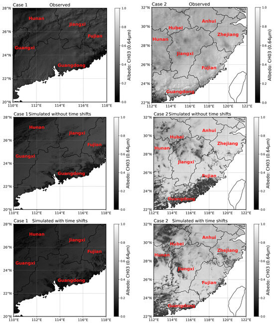 Figure 5 shows the spatial distribution of measured albedo data from the CH03 channel of the Himawari-9/AHI, alongside simulated data before and after time-shift adjustments. The first row depicts the measured albedo data, the second row shows the simulated albedo data at the time of the measurements, and the third row presents the simulated albedo data after the time-shift adjustment. In Case 1, the position of the cloud map changed minimally before and after the time shift and aligned with the measured cloud map. This is attributed to the influence of cold air moving southward on the northern side and Typhoon Sanba on the southern side, which caused the position of the cloud tops to remain nearly unchanged, remaining concentrated over Guangdong Province and other regions of southern China. In Case 2, the progression of the measured cloud map was considerably faster than that of the simulation, with the cloud layer already extending to coastal areas such as Guangdong and Fujian, while the simulated cloud map remained inland. After the time-shift adjustment, the simulated cloud top position aligned with the actual situation, thereby correcting the cloud position in the simulation.
