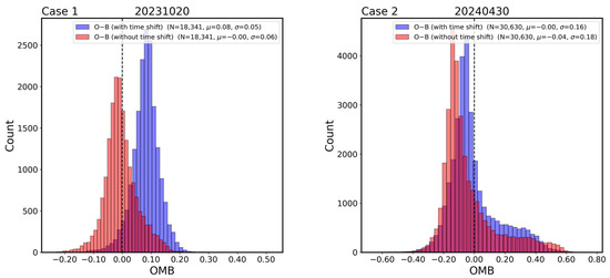 To further investigate the effect of time shifts, this study compared the probability density function (PDF) distribution and spatial distribution of the OMB before and after the time shifts. The PDF is a key tool for describing the probability distribution of continuous random variables. It visually illustrates the distribution pattern of the variable of interest. The mean determines the central location of the distribution, while the standard deviation dictates its width. In contrast, spatial distribution offers a more intuitive visualization of the variations at different locations.