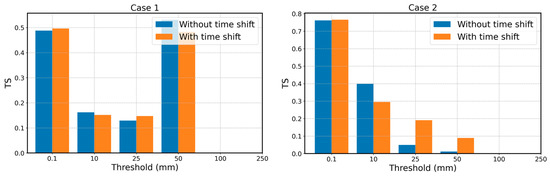In Case 1, the impact of the time-shift method varies across different precipitation thresholds. At the 0.1 mm threshold, the TSs before and after the time shift are both close to 0.5, indicating good forecast accuracy at this threshold. At the 10 mm threshold, the threat score before the time shift is 0.162, slightly higher than the score of 0.152 after the time shift. At the 25 mm threshold, the threat score after the time shift is higher than that before. However, at the 50 mm threshold, the threat score before the time shift (0.531) is higher than the post-shift score (0.483). In Case 2, the time-shift method significantly improves forecast accuracy for high-precipitation events. At the 0.1 mm threshold, the threat scores before and after the time shift are both near 0.76, indicating very high forecast accuracy. As the precipitation threshold increases, the threat score gradually decreases. At the 10 mm threshold, the threat score before the time shift is 0.39, slightly higher than the score of 0.30 after the time shift. At both the 25 mm and 50 mm thresholds, the threat score after the time shift is higher than before, though the overall scores are lower, indicating a reduction in forecast accuracy.