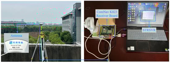 B2b data collection experimental setup. The left panel is the antenna we used, while the right panel displays the ComNav K823 receiver board.