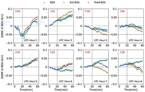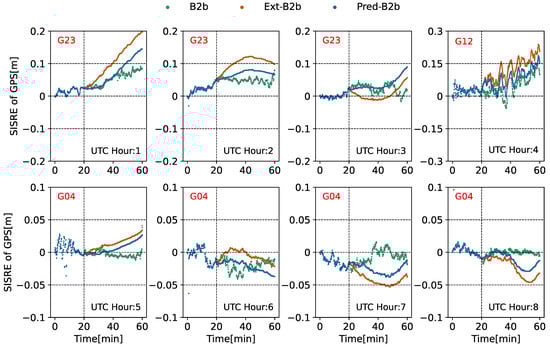 Taking 8 h of data from GPS between the times 00:00 and 07:00 on DOY (Day of Year) 340 in 2023 as an example, we manually interrupted the B2b signal data at the 20th minute of each hour and then predicted the data for the subsequent time period (e.g., if the interruption occurred at 00:20, the data from 00:20 to 01:00 was Pred-B2b and Ext-B2b). Figure 2 and Figure 3 illustrate the SISRE of some of the BDS-3 and GPSs during each hour, comparing the continuous B2b arcs under normal conditions with those under Pred and Ext scenarios. As is evident from Figure 2, for BDS-3, the SISREs are generally less than 0.1 m. From 02:00 to 03:00, for C32, the Pred-B2b aligns well with B2b, whereas the Ext-B2b exhibits a noticeable deviation. For C20 and C39 from 06:00 to 08:00, although both Pred-B2b and Ext-B2b show deviations, Pred-B2b clearly demonstrates a better fit. Turning to Figure 3, the GPS exhibits similar characteristics; however, as shown in Hour 4, the SISRE of B2b, along with the SISRE of the Pred-B2b and Ext-B2b, exceeds 0.15 m. This is attributed to the relatively low accuracy of the B2b corrections in the GPS [30].