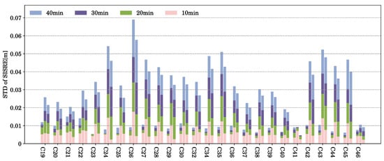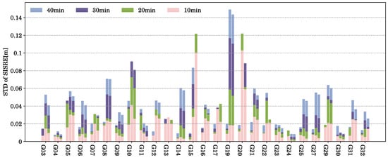 To further analyze the SISRE precision of the two prediction methods during signal interruptions, we processed hourly data over three days: the first twenty minutes of each hour received the B2b signal normally, followed by a prediction starting from the 20th minute. It is important to note that the generation of B2b products relies solely on reference stations in China and nearby regions, leading to a constant bias in the B2b clock corrections [30]. Consequently, we performed statistical analyses of the SISRE STD for the Ext and Pred prediction modes during interruption durations of 10, 20, 30, and 40 min (with B2b serving as a comparison without interruptions). Figure 4 and Figure 5 illustrate the STD of the SISRE for each satellite, presented as bar charts under different conditions.