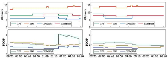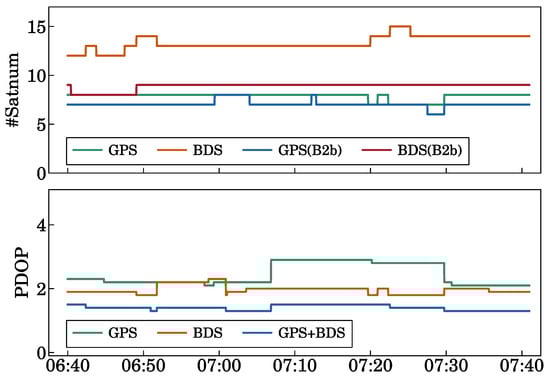 The observable number of satellites for the two data segments is shown in Figure 7. It can be observed that, except for the period from 1:15 to 1:37 on DOY 120, when the number of GPS satellites was relatively low, the number of satellites in the two segments was similar at other times. It is also evident that BDS has a higher number of observable satellites. However, since B2b only broadcasts corrections for BDS-3 satellites, the number of matched BDS-3 satellites is close to the observable number of GPS satellites. In comparison, after fusing GPS and BDS-3, the PDOP (position dilution of precision) can be maintained below 2. Therefore, in this test, we utilized the combined positioning results from BDS-3 and GPS.