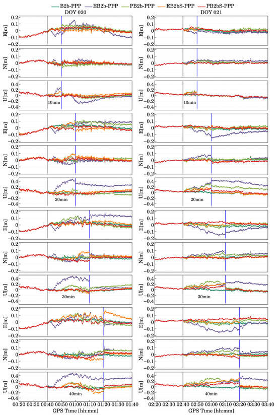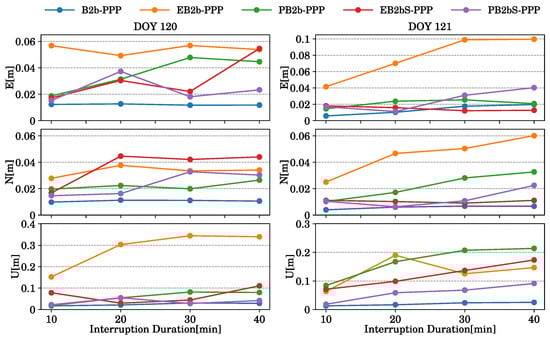 The positioning errors in the E/N/U directions for the B2b-PPP, EB2b-PPP, PB2b-PPP, EB2bS-PPP, and PB2bS-PPP under signal interruptions of 10 min, 20 min, 30 min, and 40 min on DOY 120 and 121.