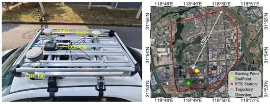 To demonstrate the kinematic positioning accuracy of B2b-PPP prediction and positioning model under B2b signal interruption conditions, we conducted practical kinematic positioning tests in Nanjing on DOY 177, 2024. As illustrated in the left panel of Figure 10, a CHCNAV I90 receiver was mounted on the roof of a vehicle to capture kinematic BDS-3 and GPS observation data during the test. The CGI-430 GNSS/INS integrated navigation device from CHCNAV served as the benchmark for kinematic positioning, and the base station ZHD0 in Figure 6 provided the RTK reference for CGI-430. Concurrently, we employed the board depicted in Figure 2 to receive B2b corrections in real-time for B2b-PPP. As evidenced by the test trajectory in Figure 10 (right), there were no GNSS interruptions recorded throughout our entire test route, and the maximum linear distance between the test route and the ZHD0 station was 3.7 km. Under such circumstances, the nominal accuracy of the CGI-430 can achieve 0.02 m in the horizontal and 0.03 m in the vertical direction, providing a precise and genuine positioning accuracy reference for evaluating our B2b-PPP approach. Notably, when outputting the dynamic positioning results from the CGI-430, we conducted lever arm corrections to align the positioning outcomes with those from the I90 receiver.