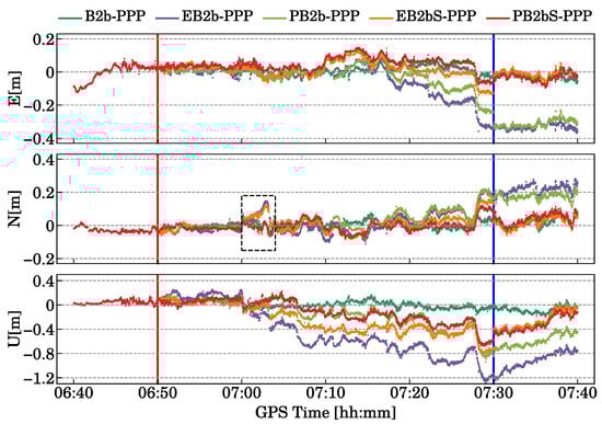 Positioning errors in the E/N/U directions for various PPP models (B2b-PPP, EB2b-PPP, PB2b-PPP, EB2bS-PPP, and PB2bS-PPP) during a 40 min B2b signal interruption in the kinematic experiment.