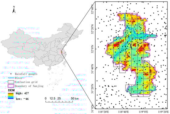 The study area for this research is Nanjing City (118.2°E–119.4°E, 31.0°N–32.8°N), located in eastern China, as illustrated in Figure 1. The terrain in this area primarily consists of plains and low hills. In this region, the topography generally has a minimal impact on precipitation, which helps to reduce terrain-related interference in the evaluation of quantitative precipitation. Nanjing experiences a humid subtropical climate influenced by the boreal monsoon, with an annual average rainfall from 800 to 1200 mm, predominantly occurring between May to September. The types of rainfall in this region include typhoon-induced rainfall and local rainfall.