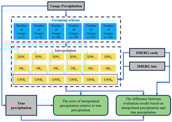 After sampling, the inverse distance weighting (IDW), ordinary kriging (OK), and geographical weighted regression (GWR) methods are employed to interpolate the station data. Among these, the GWR method is specifically used to interpolate the difference between the observed station precipitation data and the satellite precipitation data, with satellite precipitation serving as the background field for interpolation. Depending on the chosen background fields, the interpolation results are categorized into the GWRearly and the GWRlate, which are utilized to evaluate the corresponding satellite precipitation products. The research area contains 445 ground-based rainfall gauges, resulting in a high station density with an average of 2 gauges per grid cell. If multiple ground-based rainfall gauges are present in a grid cell, the average precipitation observed from these gauges is considered the true precipitation. In cases where no rainfall gauges are available in a grid cell, true precipitation is obtained from the eight nearest gauges using the IDW method. The results indicate that over 95% of the grid cells contain rainfall gauges, thereby ensuring the reliability of the derived true precipitation.