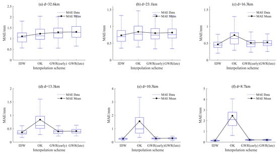 Regarding the classification indices, the POD values highlight the advantage of the IDW method, with the lower quartile exceeding 0.96 when km and above 0.98 at km. Although the GWR methods perform slightly worse than IDW, their lower quartile still exceeds 0.93 when km. Moreover, the GWRearly and GWRlate have similar POD values at lower station densities. But as the station density increases, the POD values of the GWRearly are slightly larger than those of the GWRlate. The POD values for the OK method decrease as the station density increases. In contrast, the FAR values for GWRearly, GWRlate, and OK are consistently below 0.15, while those for IDW remain below 0.10. The FAR values of the GWR methods decline with increasing station density, with GWRearly showing lower FAR values than GWRlate. For the OK method, the FAR values decrease initially but then increase, with the lowest median FAR observed at d = 10.3 km, although it is still 0.10. In contrast, the IDW method’s FAR median is only 0.02. The results from the CSI closely mirror those from the POD, reinforcing IDW’s superiority in interpolating precipitation, with the CSI median consistently above 0.90.