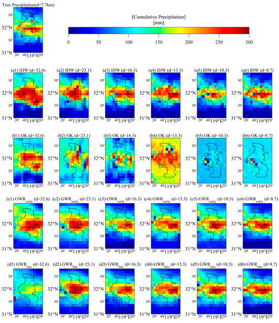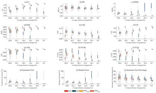 Combined with Figure 5, it is found that the evaluation results of the IDW-based and GWR-based RPs are close to those of the true precipitation when the average station distance is below a medium level ( km).