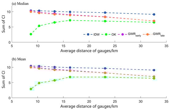 With the decreases in the average station distance, the total composite index (CI) for the RP generated by both the IDW and GWR methods gradually increases, indicating that the RP increasingly approximates the true precipitation. Simultaneously, the gap between the RPs from the IDW and GWR methods narrows. The total CI for the OK method initially rises but then declines, peaking at d = 16.3 km. At larger average distances between gauges, the total CI for the GWR and OK methods are comparable, with the RP from the GWR method outperforming that from the OK method. However, at smaller average station distances, the total CI for the GWR and IDW methods is similar, with GWRearly and GWRlate showing little difference.