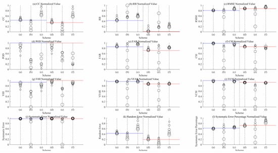 Normalized median distributions of the evaluation indices of the RP and true precipitation for evaluating near-real-time satellite precipitation products: (a), (b), and (c) present the RP obtained by the IDW, OK, and GWR methods to evaluate the IMERG early, and (d), (e), and (f) present the RP obtained by the IDW, OK, and GWR methods to evaluate the IMERG late. The circular symbols represent the average station distance d of 32.6, 23.1 km, 16.3 km, 13.3 km, 10.3 km, and 8.7 km. The smaller the average distance is, the larger the diameter of the circles is. The blue and red lines represent the results of the IMERG early and IMERG late products relative to the true precipitation.