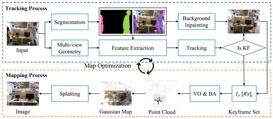 In this context, our exploration of map representation turns to 3D Gaussian radiance fields [20] as an explicit representation. Gaussian Splatting inherits the advantages of NeRF in generating high-quality images and scenes while achieving a faster rendering speed and allowing direct gradient flow to each parameter, which is more favorable for optimization compared to NeRF’s indirect gradient flow. The 3D Gaussian representation can generate explicit maps with clear spatial ranges, providing more possibilities for downstream applications such as mixed reality and autonomous driving [21,22]. Recent studies [23,24,25,26] have also demonstrated the possibility of integrating 3D Gaussians with SLAM systems. These SLAM systems achieve good dense map reconstruction in static scenes by building 3D Gaussian maps. The traditional dynamic visual SLAM method can provide accurate pose estimation for the construction of dense Gaussian maps. However, these methods either do not process the input image and still retain the dynamic object, or they are segmented, leaving a large area of blank space. There are unacceptable for Gaussian map optimization using such original images.