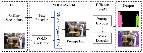 Many dynamic SLAM methods based on semantic segmentation [34,45] are trained only for a few fixed objects (such as humans, cars, animals), which poses significant limitations. Our aim is to provide a system for dynamic object detection and segmentation that can be easily adapted to various dynamic scenes without the need for retraining. The Segment Anything Model [46] serves as a powerful foundational model for interactive object segmentation, demonstrating zero-shot generalization capability. However, SAM encounters two challenges in SLAM applications: firstly, SAM’s processing speed is slow, resulting in poor real-time performance. Secondly, SAM can only perform complete segmentation without semantic information or work through interactive points and boxes, which is unsuitable for SLAM systems. To tackle the first challenge, we opted for SAM’s accelerated version, EfficientSAM [47], as the core of our segmentation module. Addressing the second challenge, we introduced an additional real-time open-vocabulary detection module, YOLO-World [48]. This module annotates detection boxes in the image, which SAM then uses as prompts for dynamic object segmentation. The specific workflow is illustrated in Figure 2.