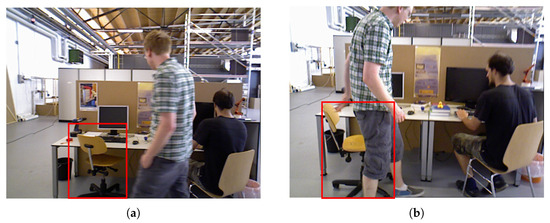RGB images in TUM RGB-D dataset. (a) Frame 690. (b) Frame 765. The red boxes indicates the chair being moved. This is often semantically static but actually moving.