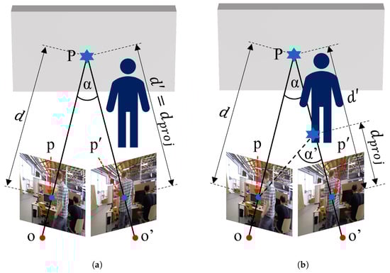 The feature point p on the keyframe projected onto the current frame is p’, and O and O’ are the two frames corresponding to the optical center of the camera, respectively. (a) Feature point p’ is static (). (b) Feature point p’ is dynamic ().