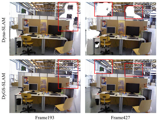 Effect of background inpainting or not on DyGS-SLAM scene reconstruction. The red boxes indicate the reconstruction effects of different methods. (a) Reconstruction w/o background inpainting. (b) Reconstruction w/background inpainting.