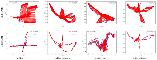 Figure 6 presents a comparison between the camera trajectories estimated by our system and ORB-SLAM3 on selected sequences and the ground truth trajectories. The system’s accuracy is depicted by the closeness between the estimated trajectory (blue line) and the ground truth trajectory (black line), with the red line representing the error between them. It is evident that our system estimates trajectories closer to the ground truth trajectories compared to ORB-SLAM3 in these sequences.