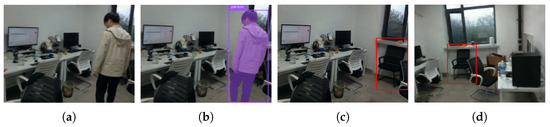 To further validate the practicality of our method, we captured real-world scene data using the Intel RealSense L515 RGB-D camera (made by Intel, Santa Clara, CA, United States) at 30 fps and a resolution of 640 × 480. Figure 11 illustrates the details of our approach at each stage. In this scene, individuals are engaged in random movements, as depicted in Figure 11a. Figure 11b shows the mask provided by the segmentation module, while Figure 11c displays the results of our background restoration, revealing the complete restoration of the black chair obscured in the image. Figure 11d demonstrates the successful recovery of regions occluded by dynamic objects in the synthesized novel views, illustrating how our approach mitigates the influence of dynamic objects and constructs a realistic static scene. Meanwhile, real-time performance is very important for SLAM systems. Therefore, we evaluated the runtime required by our method for each task in a real scenario, as shown in Table 4.