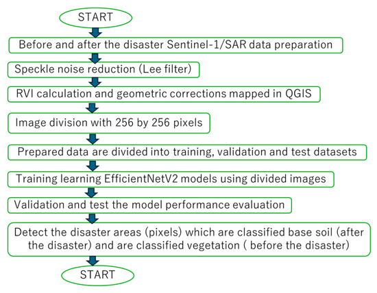 Process flow of the proposed flow is shown in Figure 2. To analyze the disaster, Sentinel-1 SAR data acquired before and after the event are first prepared. Speckle noise reduction is performed to enhance classification performance. Next, geometric correction is applied to align the data with topographic maps as the SAR imagery may be distorted due to radar shadowing, foreshortening, and layover. QGIS is used for disaster mapping during this process. The radar vegetation index (RVI) is calculated using Equation (1). The processed SAR data are then divided into 256 × 256-pixel patches to facilitate training, validation, and testing of the learning model, which is based on the EfficientNetV2 architecture. Once the model is trained, validated, and tested, its classification performance is evaluated.