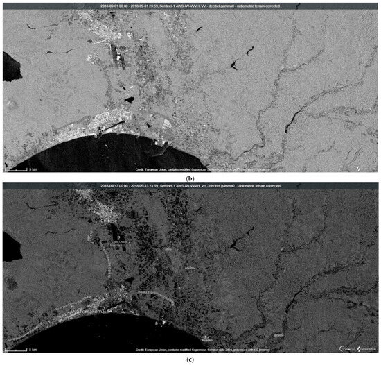 The training data were sourced from Sentinel-1 SAR VV and VH polarization datasets acquired on 20 August, 24 August, 13 September, and 17 September 2018. These dates correspond to pre-disaster and post-disaster periods. The data processing involved the following steps: