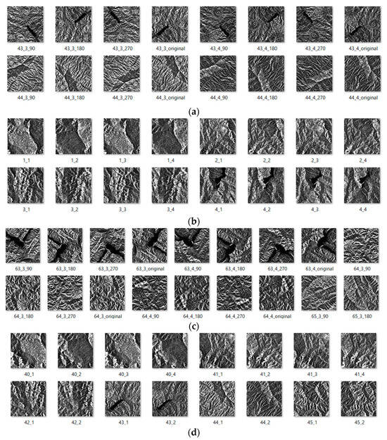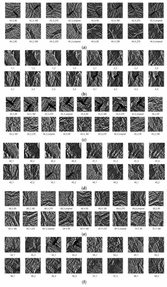 Small portions of training, validation, and test samples of the VV polarization of the imagery data for landslide areas and those for non-landslide areas. (a) A small portion of training samples from the VV polarization of the imagery data for landslide areas; (b) a small portion of training samples from the VV polarization of the imagery data for non-landslide areas; (c) a small portion of validation samples from the VV polarization of imagery data for landslide areas; (d) a small portion of validation samples from the VV polarization of the imagery data for non-landslide areas; (e) a small portion of test samples from the VV polarization of the imagery data for landslide areas; (f) a small portion of test samples from the VV polarization of the imagery data for non-landslide areas.