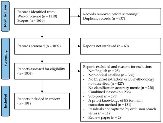 The review process utilised Rayyan, a free online platform that facilitates the rapid screening, categorisation, and labelling of bibliographic entries to streamline synthesis []. Initially, duplicates were identified and excluded. Then, a full-text review of the remaining articles was conducted to identify and analyse the most relevant studies for inclusion (Figure 1). Studies using supervised or unsupervised classifications without providing accuracy metrics for BS results were excluded due to the inability to assess the algorithm’s efficacy. This review focuses only on BS identification; therefore, papers where BS was grouped together with other land classes, such as rock or sand, or categories that are not explicitly BS are excluded. Additionally, articles which utilised spectral unmixing in order to determine fractional BS cover were also excluded, as this review is focused on the identification of pure BS pixels only. Articles that focused solely on classifying BS based on pre-existing ground truth knowledge were also excluded. For example, some authors use a priori understanding of the agricultural landscape in the region to build BS composites with imagery from ‘bare soil periods’ [,]. In addition, articles that do not use any BS identification methodology or do not describe the methodology were not included, nor were review papers. The review articles identified and removed from the analysis were not BS identification review papers. In total, 191 articles were identified and are summarised and analysed within the Results section (Table A2).