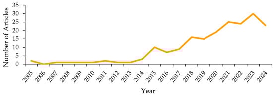 The analysis revealed a substantial increase in the use of BS identification methods using remote sensing data since the first published journal article in 2005 (Figure 2). After a period of minimal use between 2005 and 2013, the number of published articles on this topic began to rise from 2014 onward. This pattern underscores the growing reliance on and refinement of remote sensing techniques in earth observation, driven by a combination of technological advancements in satellite imagery, increased availability of high-resolution data, and a growing scientific interest in more precise land cover and soil analysis.