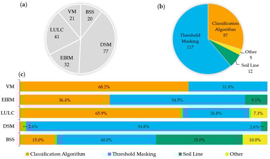 (a) Number of articles per research area. (b) Number of articles using each distinct BS methodology. (c) Method of BS identification for each research area. BSS, Bare Soil Separation; VM, Vegetation Mapping; EIRM, Environmental Impact and Risk Mapping; LULC, Land Use Land Cover; DSM; Digital Soil Mapping.