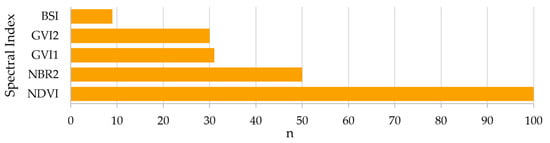The most commonly used sensors in the identified studies were Landsat 8 OLI, followed by Landsat 5 TM, Sentinel-2, and Landsat 7 ETM+ (Table 2). These sensors are frequently utilised due to their robust spectral range, moderate spatial resolution, and wide availability of historical data, making them particularly suitable for long-term environmental monitoring and land cover change studies. Multispectral sensors, such as those used in the Landsat and Sentinel platforms, dominate the research landscape due to their ability to capture imagery in multiple bands across the visible, near-infrared (NIR), and shortwave infrared (SWIR) regions, which are critical for identifying and extracting BS surfaces []. For example, Sentinel-2 provides 12 optical bands with a spectral range from 0.458 µm to 2.28 µm and a spatial resolution of 10–60 m, offering detailed imagery that supports a variety of land monitoring applications. Hyperspectral sensors (PRISMA and EO-1 Hyperion) capture data in hundreds of narrow, contiguous bands. They are less frequently employed in BS identification studies with the exception of some VM and DSM studies. This infrequent use may be due to the higher data processing complexity and limited availability of hyperspectral datasets compared to the more accessible multispectral imagery. However, due to the number of spectral bands, hyperspectral data contain much more information about the spectral profile of the target. When considering the similarities between BS and other land covers, such as non-photosynthetic vegetation (NPV) and urban areas, it is surprising that more studies do not employ hyperspectral data, particularly when it comes to identifying BS, especially in DSM studies where hyperspectral data can be more valuable [,].