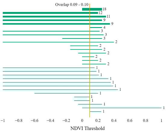 The variation in NDVI threshold ranges used to identify BS pixels. The threshold ranges are arranged by use within the literature, with bar thickness and values representing the frequency of use. The range with most overlap of NDVI values is depicted by the vertical line (0.09–0.10).