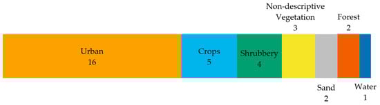 Inaccurate classifications lead to lower F1 scores, meaning that the classifier has incorrectly classified or misidentified soil with another land cover. These incorrect classifications are known as confusion classes. Figure 6 displays the land cover classes which are the most often confused with BS and vice versa, in classification studies which reported confusion matrices or explicitly included the land cover classes most frequently confused with BS. The largest portion of misclassification, accounting for 16 misclassifications, occurs between bare soil and urban areas. This is a commonly reported issue in remote sensing literature, as the spectral signatures of BS and urban surfaces often overlap [,]. As a result, many studies have focused on developing new indices or spectral methods to better distinguish between bare soil and urban areas, aiming to improve classification accuracy by enhancing the separation of these similar spectra.